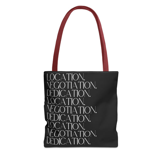 Location. Negotiation. Dedication. Black Tote Bag