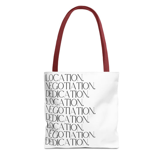 Location. Negotiation. Dedication. White Tote Bag