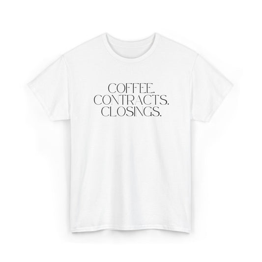 Coffee. Contracts. Closings. White Tee